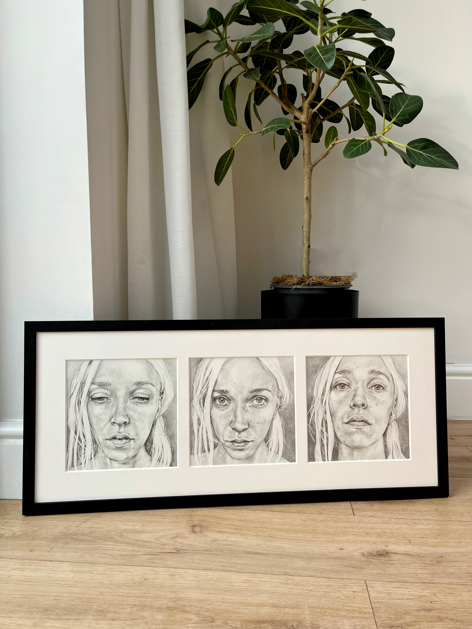 Three pencil drawings of Bernadette depicting the Three Stages of Reasoning, mounted and framed in black oak with museum anti-glare glass