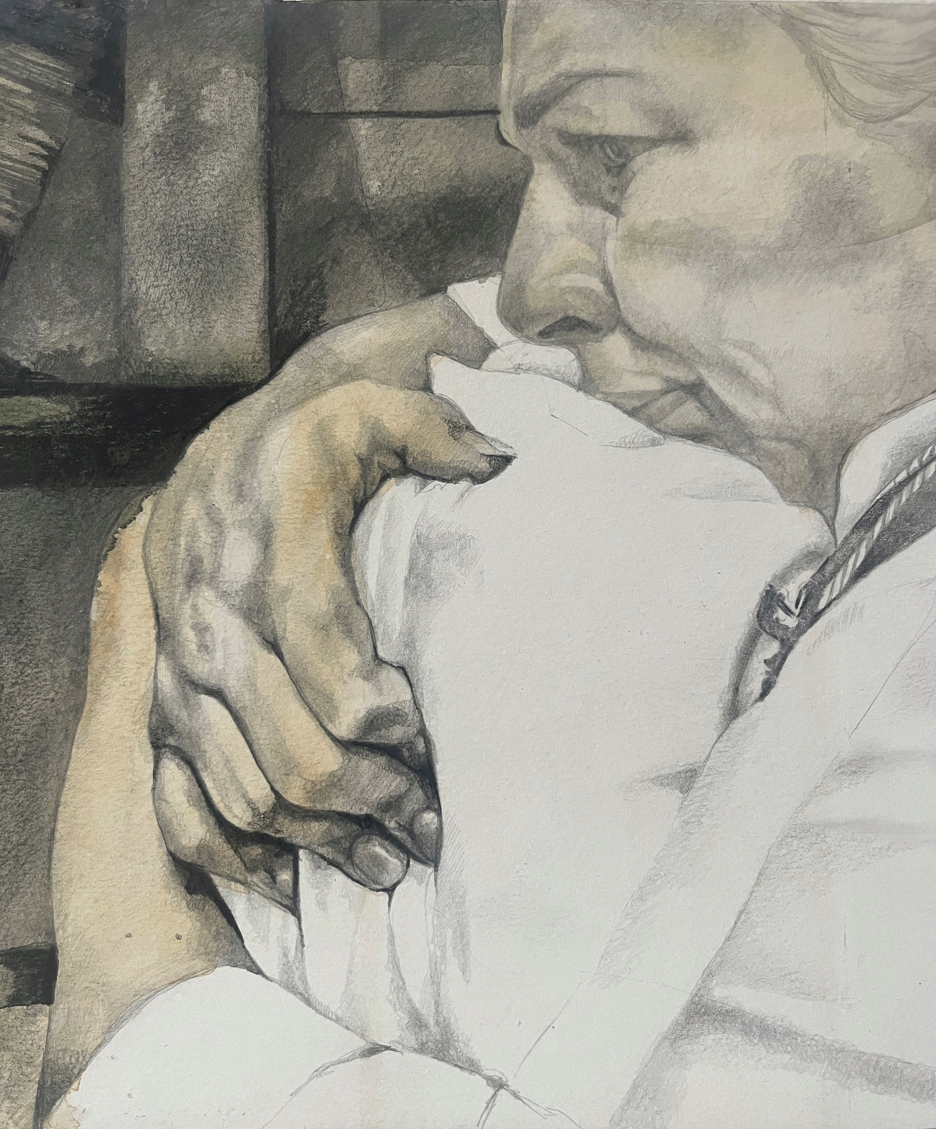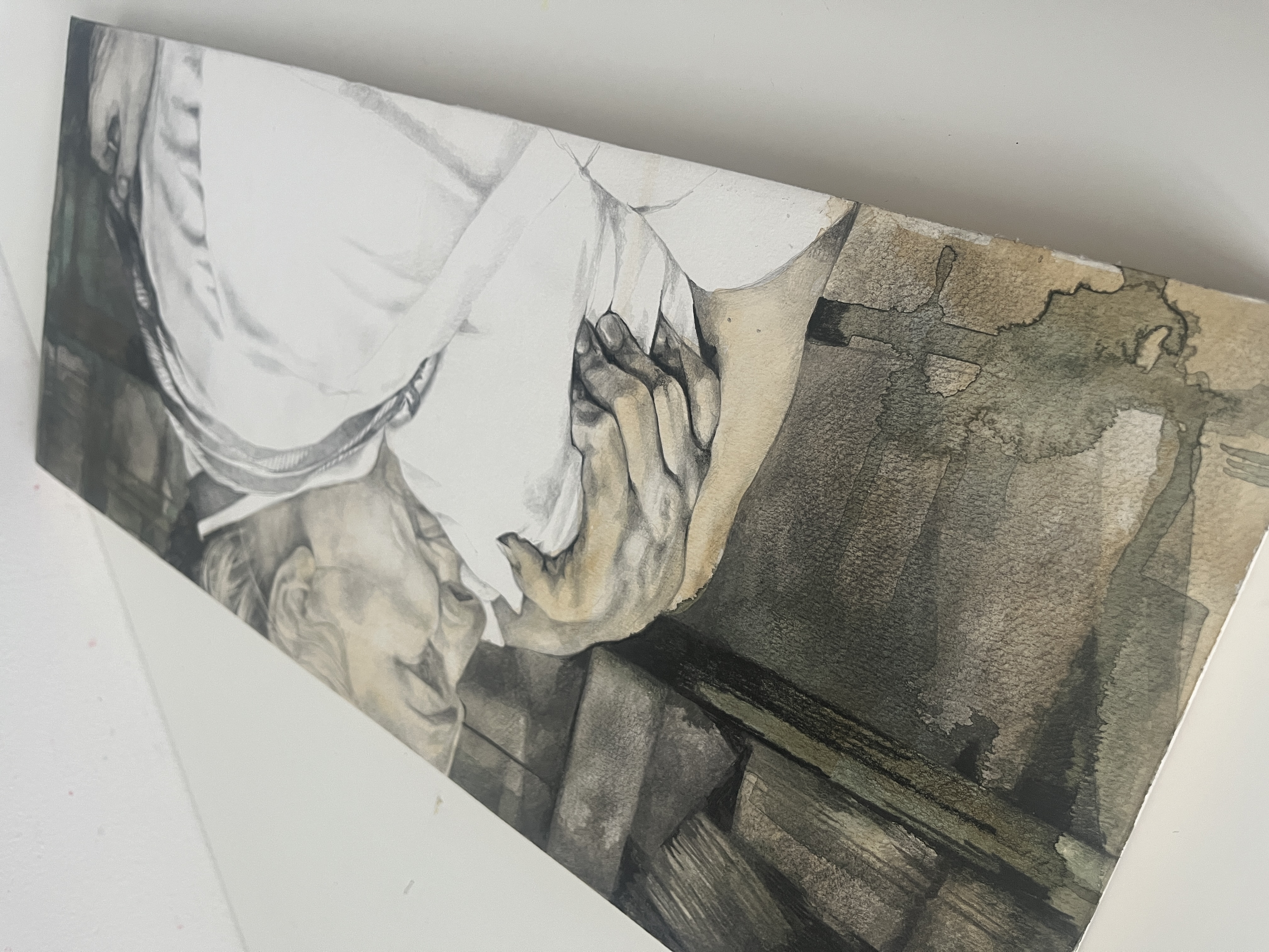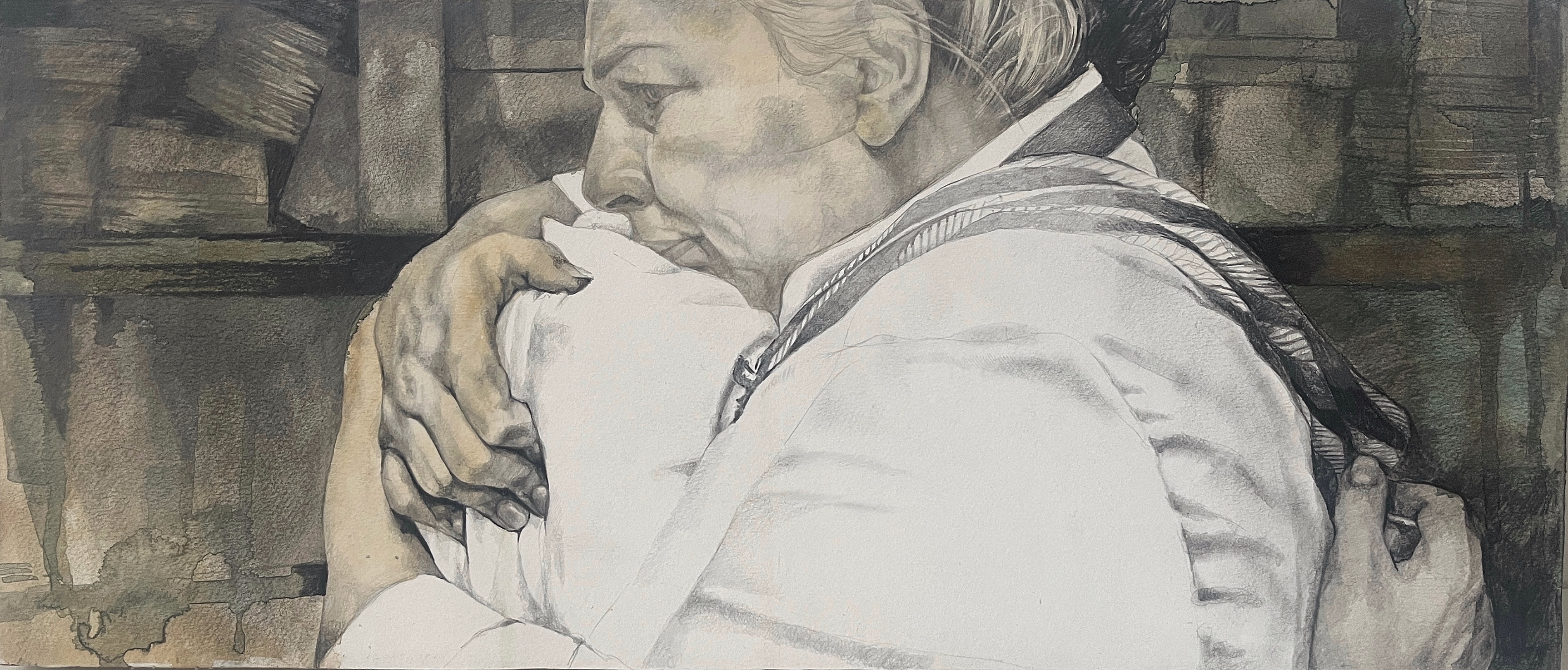 The painting was inspired by the 2021 film Boiling Point. This scene, starring Hannah Walters and Stephen McMillan is shocking and emotional and stayed with me for years, it represents maternal love, friendship, helplessness and forgiveness. Emily is distraught to see Jamie's scars, she steps back and tilts her hip, lip quivering and takes a big moment. Her then implusive, unexpected hug made me burst into tears. But the embrace, for me, was all about the hands - the strain and tension in her hand starkly contrasted by his limp and appologetic.