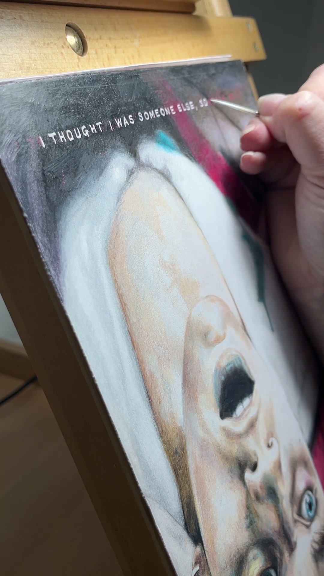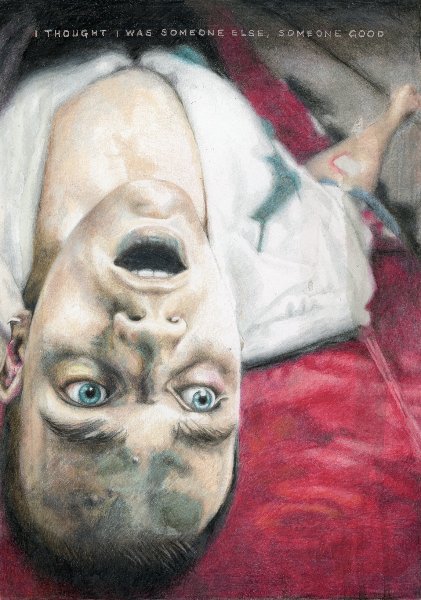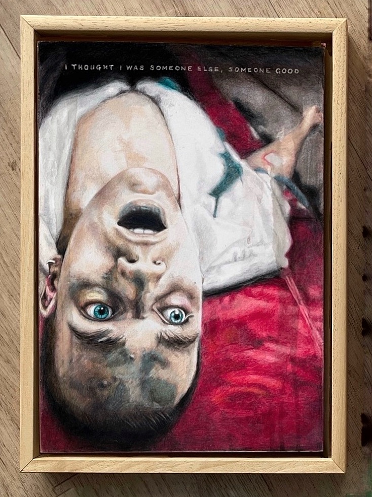 The show 'Trainspotters T30' was a celebration by Mark Blamire aka Blam from Grow Up art and Lorenzo Agius - the designer and photographer of the original Trainspotting posters in 1996. They asked 30 artists to interpret the movie for a group exhibition at Atom Gallery. This painting was the second one of mine, it feaures the line from Lou Reed's Perfect Day, which is playing during this scene. In 1996 I worked in Soho, in advertising - I was 24. The club scene was everything and this film shouted to us.